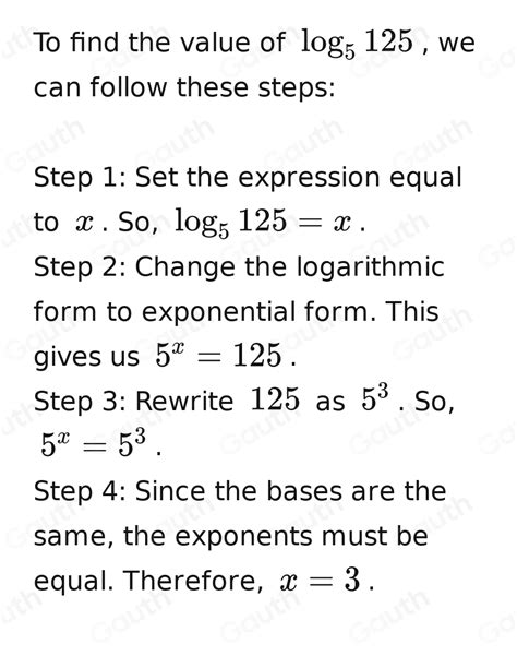 What Is The Value Of Log Subscript 5 Baseline 125. Log_5 \ 125 = log_2 \ 5^3 = 3 \times log_5 \ 5 = 3 \times 1 = 3 log5 125 = log2 53 = 3× log5 5 = 3 × 1 = 3. Log in for more information.
