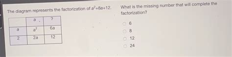 What Missing Number Would Complete The Factorization. It also multiplies, divides and finds the greatest common divisors of pairs of polynomials;. Web the diagram represents the factorization of a2+8a+12.