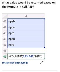 What Value Would Be Returned In Cell A49. Web what value would be returned based on the formula in cell a49? 4 =countif (a43:a47, “np*”) counts the number of cells within the range from.